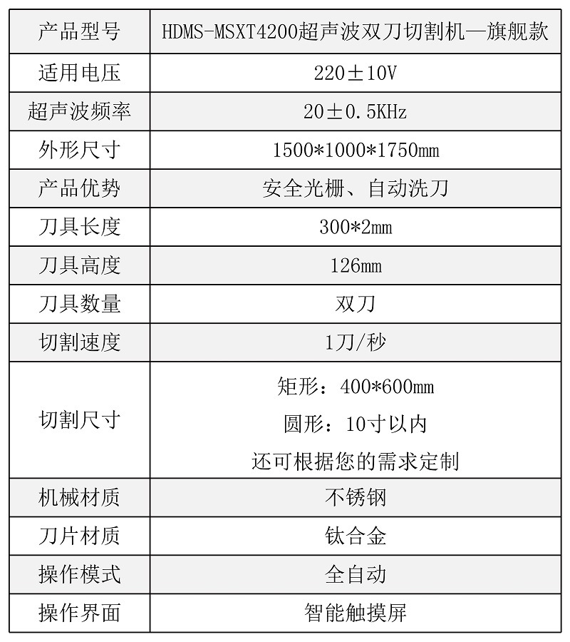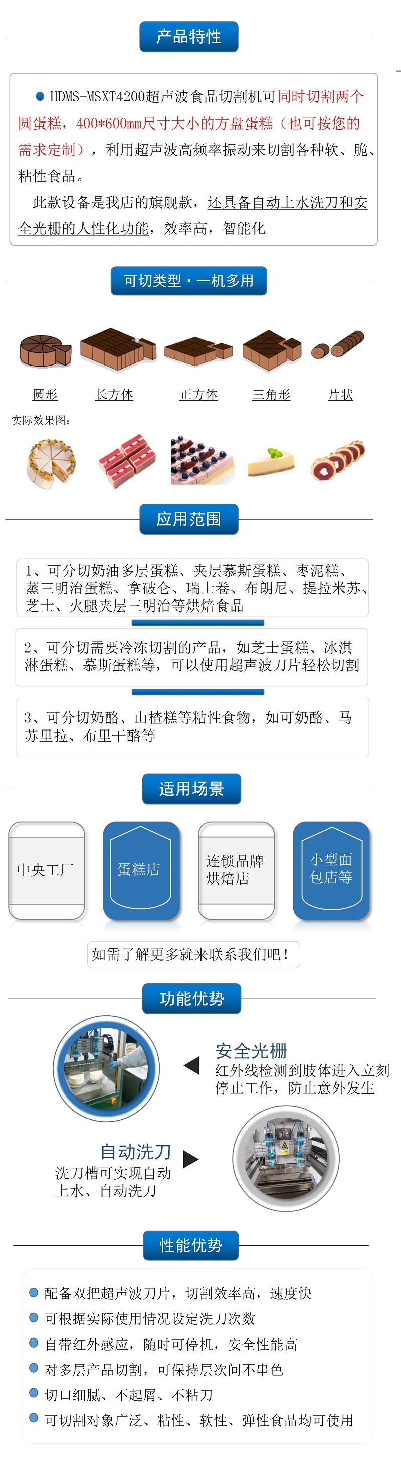 該設備配備雙把超聲波刀片,既可切方蛋糕,也可同時切兩個圓蛋糕,效率更高